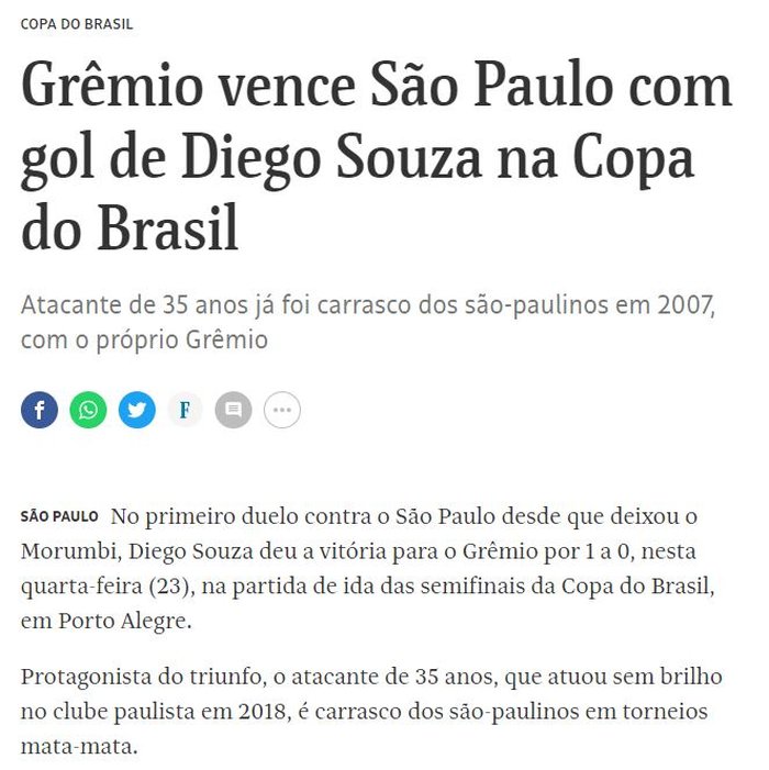 No jornal Folha de São Paulo, o destaque é o autor do gol que rendeu o triunfo gaúcho na Arena. A reportagem recorda o embate pelas oitavas de final da Libertadores de 2007, quando o então meia Diego Souza anotou o segundo gol da vitória por 2 a 0, que eliminou o time são-paulino no Estádio Olímpico. "Protagonista do triunfo, o atacante de 35 anos, que atuou sem brilho no clube paulista em 2018, é carrasco dos são-paulinos em torneios mata-mata", diz a matéria.