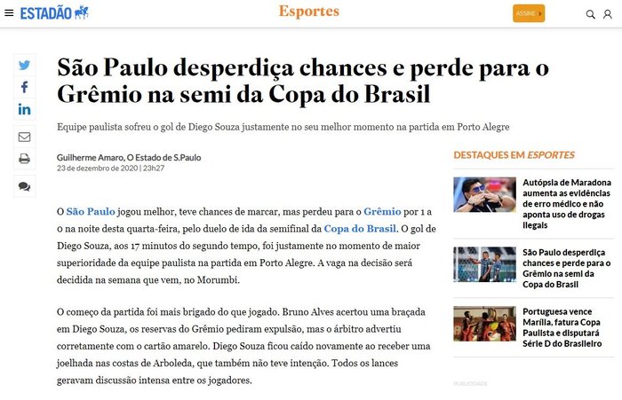 No Estadão, o tom é mais crítico para o time de Fernando Diniz que, como descreve a crônica, "jogou melhor, teve chances de marcar, mas perdeu para o Grêmio". A matéria ainda comenta que a "equipe paulista sofreu o gol de Diego Souza justamente no seu melhor momento na partida em Porto Alegre".