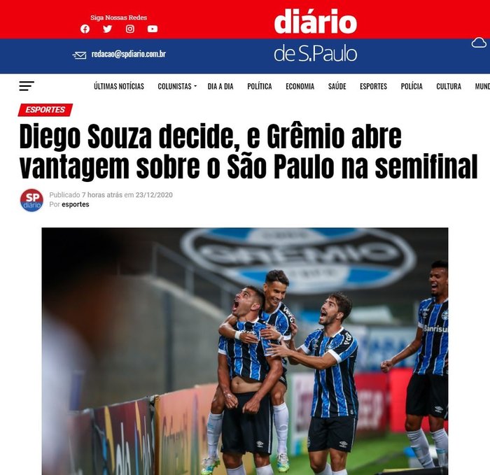 Por fim, o Diário de São Paulo também critica o São Paulo, que teve maior posse de bola e chances de gol, mas "foi novamente vítima de um antigo problema do time: não decidir quando pode". Ao mesmo tempo, elogia o Tricolor gaúcho, "guerreiro do começo ao fim", e exalta a figura de Diego Souza: "Na comemoração, o atacante do time gaúcho, especialista na lei do ex, mordeu o símbolo e vibrou muito".