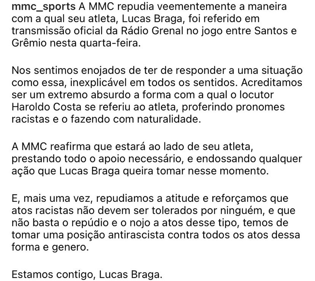 A empresa que gerencia a carreira de Lucas Braga, a MMC Sports, repudiou o comentário considerado racista em uma rede social.